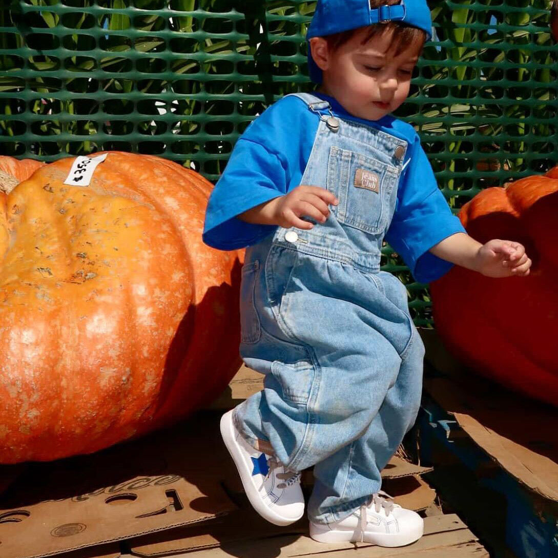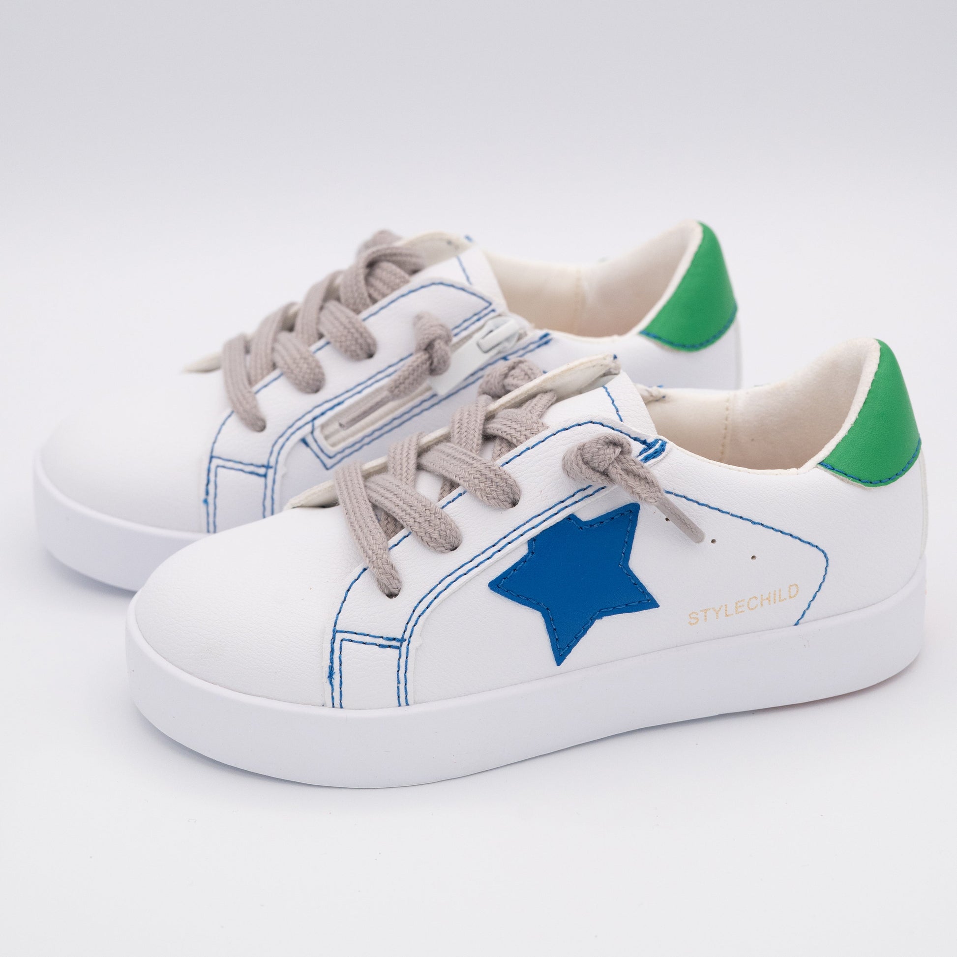 • White PU leather upper; blue leather star patch on the side; green leather heel grip