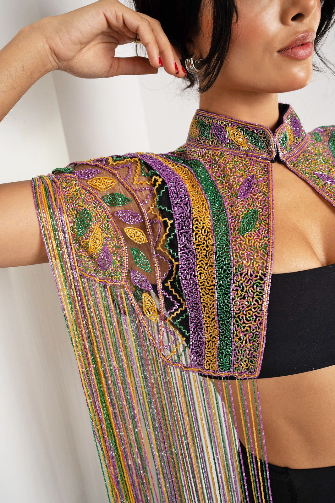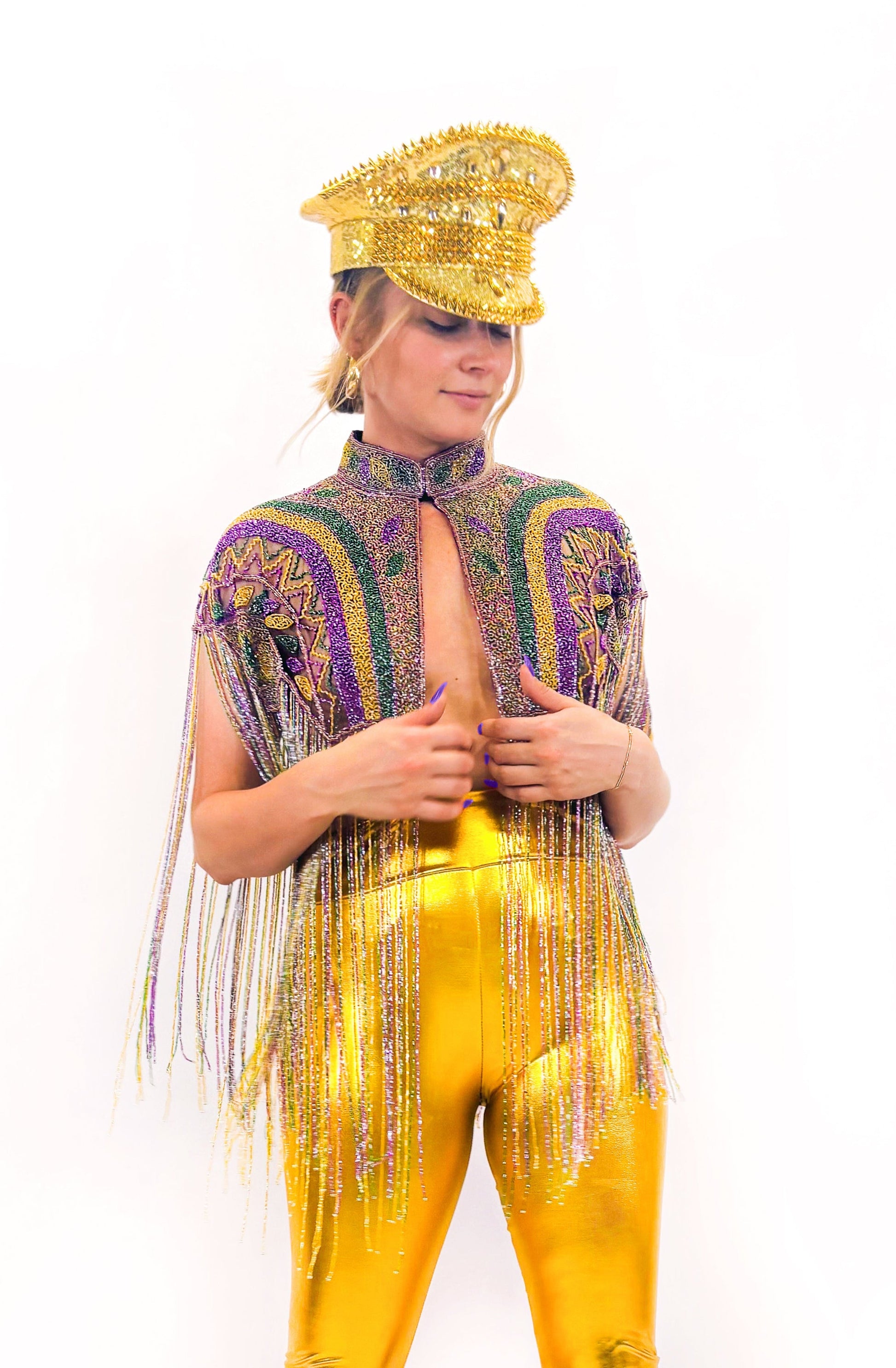 Make every moment a parade of style! This playful Beaded Fringe Capelet is inspired by festivals and second lines, perfect for Mardi Gras or any lively event. Featuring shimmering beaded fringe and intricate design in purple, green, and gold for an eye-catching statement piece that dances with you under the glowing float lights. Pair with a rhinestone conductor hat for a chic look fit for a Grand Marshall.