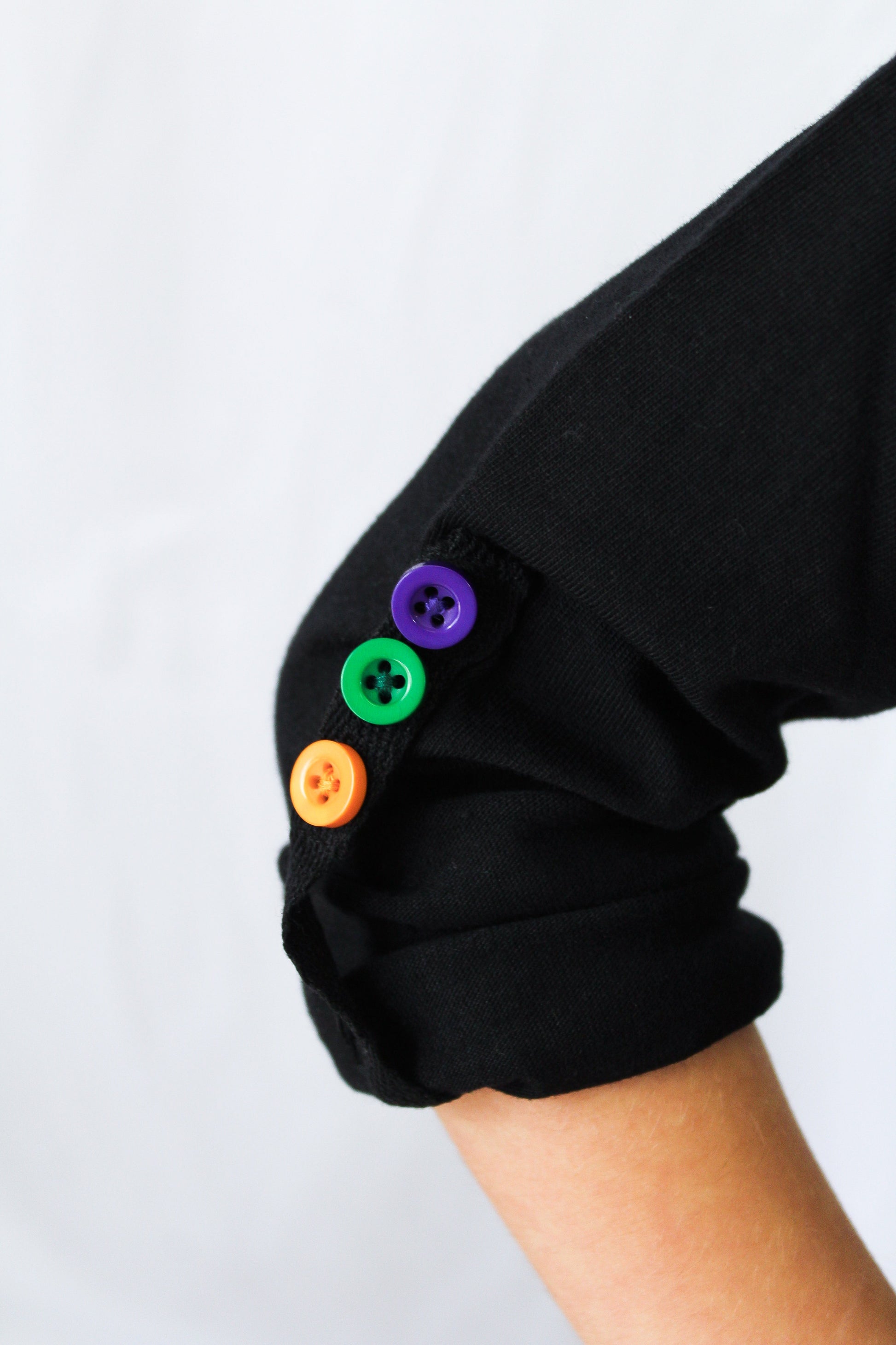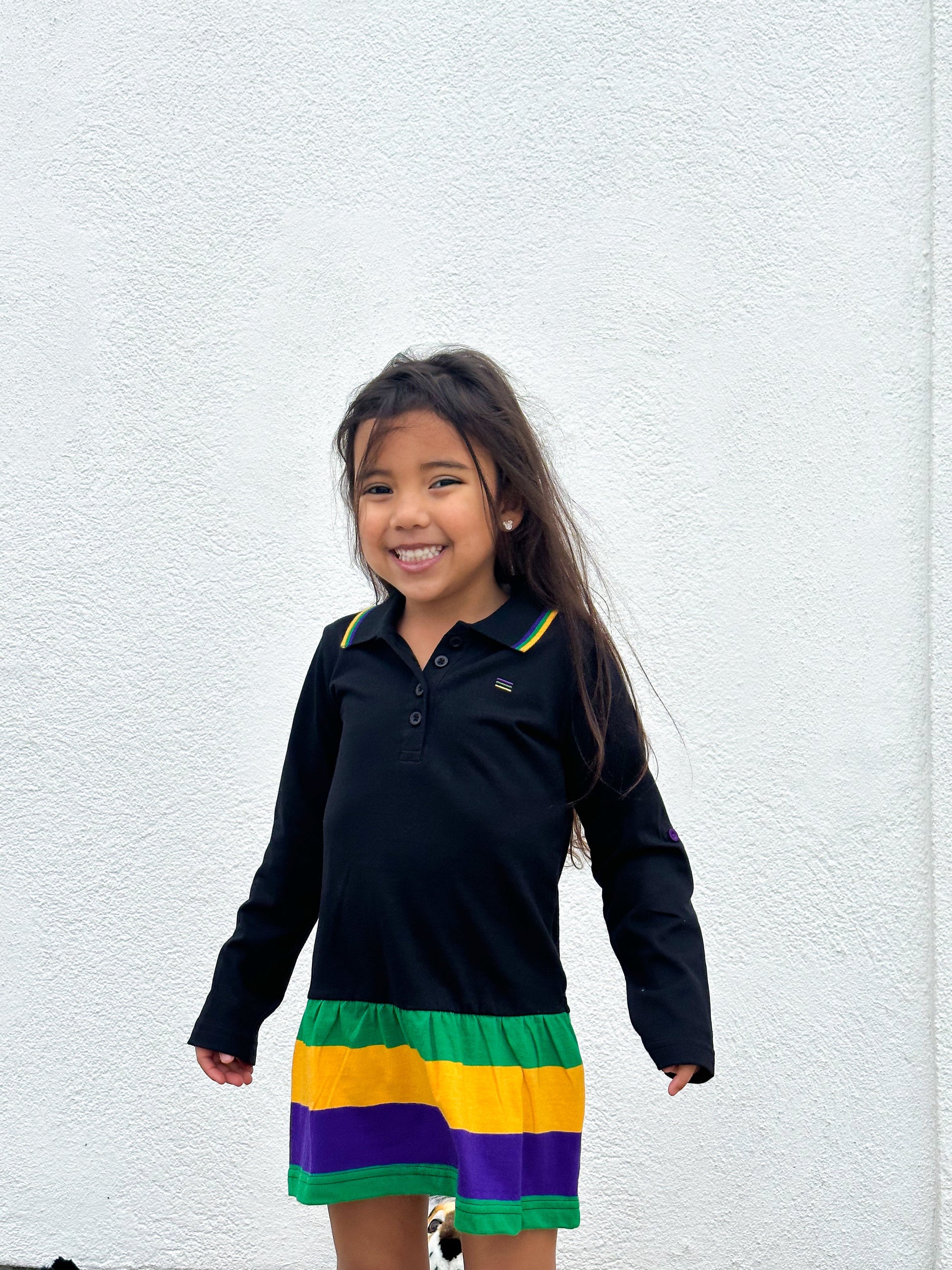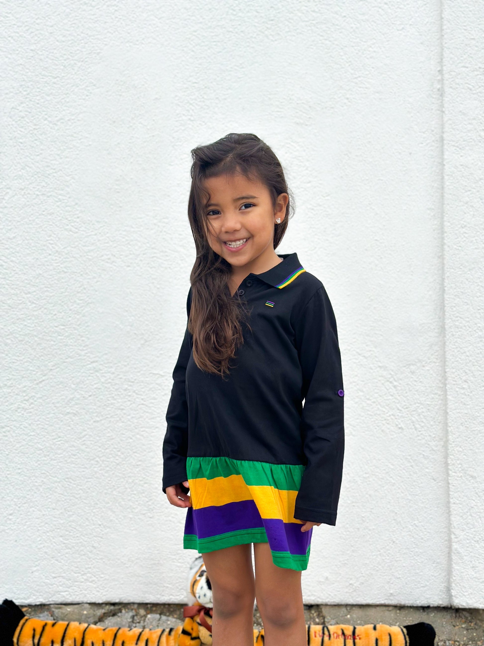 Black polo dress with purple, green, and gold striped skirt and stripes on the collar and buttons on the sleeve.