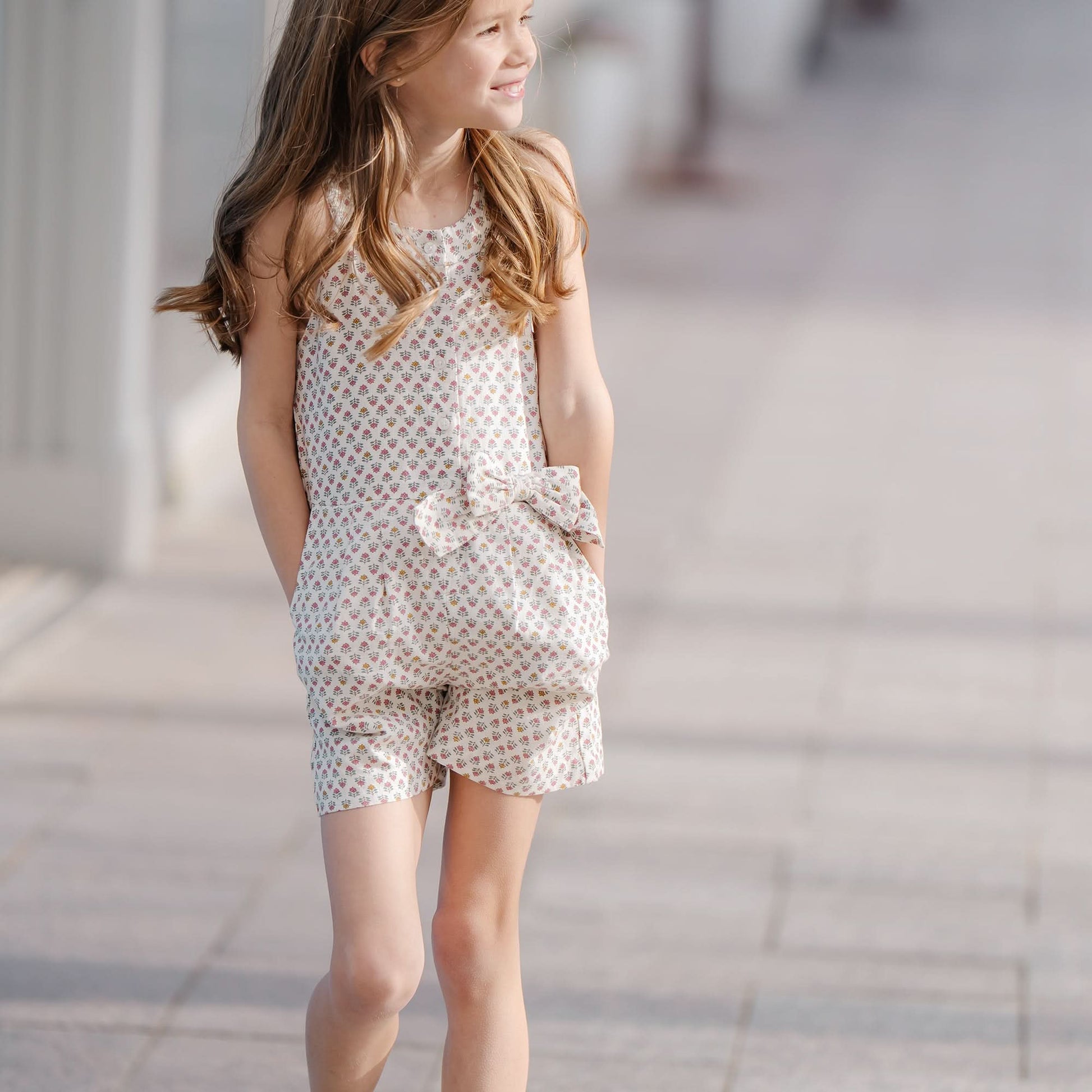 A pretty woodblock print and flattering halter neckline add a pretty touch to our summer romper cut from a beautiful organic cotton and linen blend. Features a decorative bow at the waist, a button closure down the center front, and always useful side pockets. Fully lined in organic cotton. Get the camera ready for those picture perfect moments!
