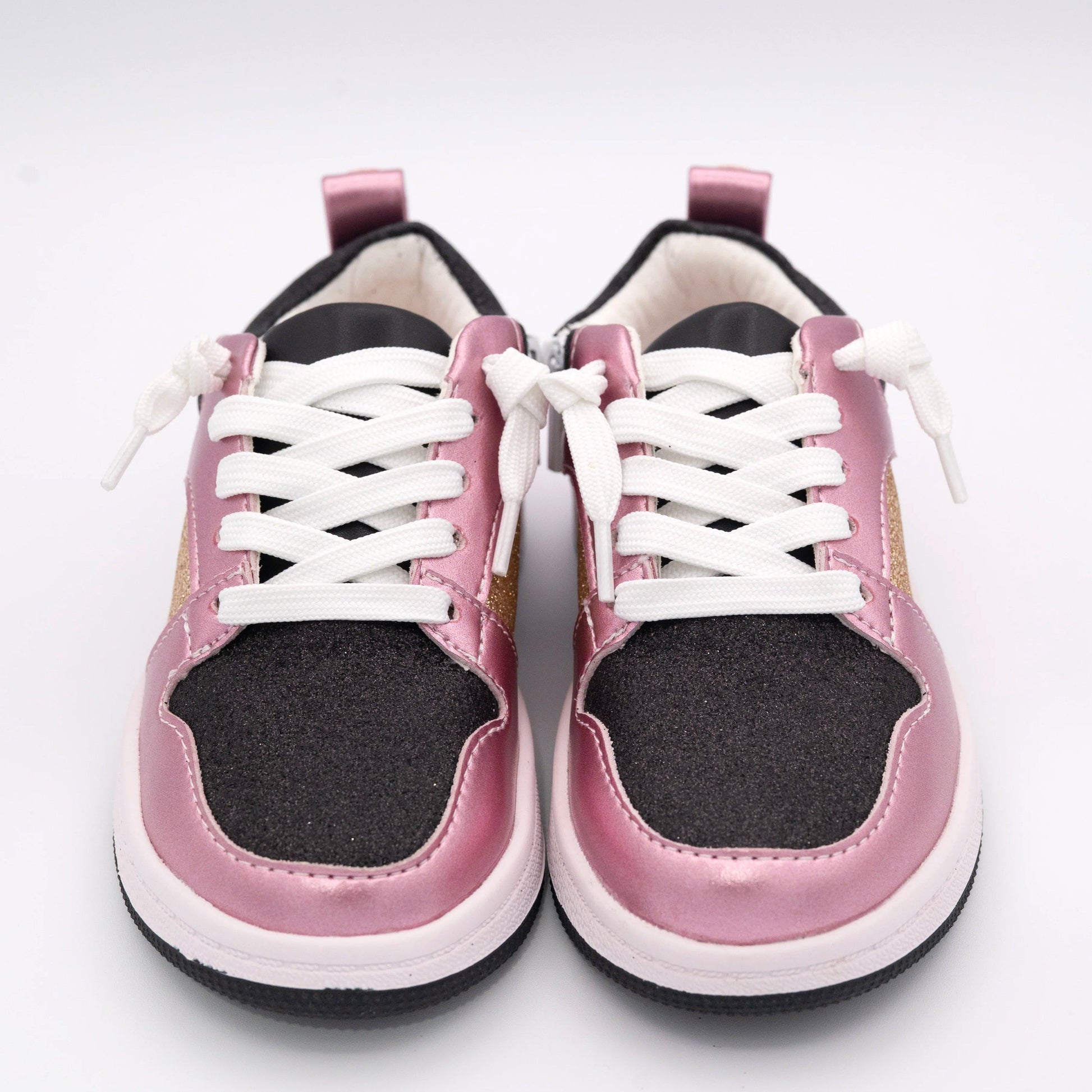 Step into style with HARLOW, our dazzling low-top sneakers featuring a chic black base adorned with playful pink and luxurious gold glitter accents. These eye-catching shoes add the perfect pop of sparkle to any outfit while keeping comfort in check. Strut your stuff and turn heads with these fun, fashionable kicks that transition effortlessly from day to night! Recommend sizing up one full size