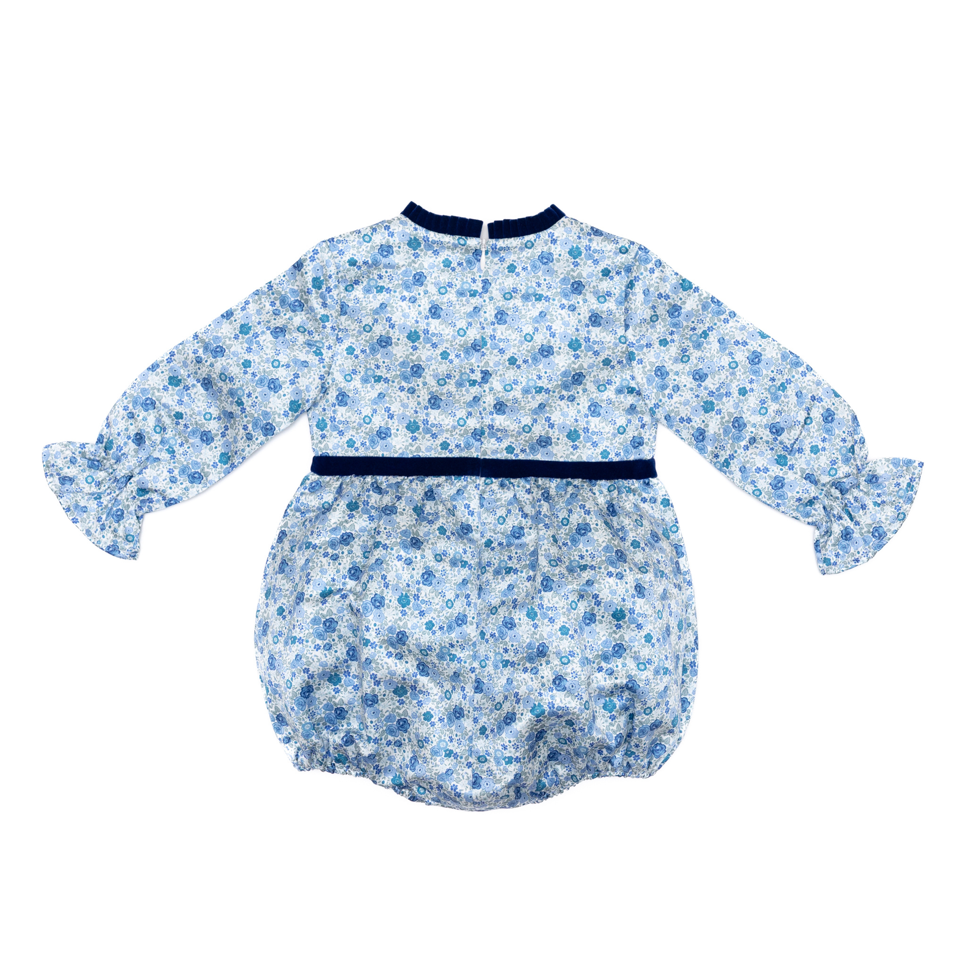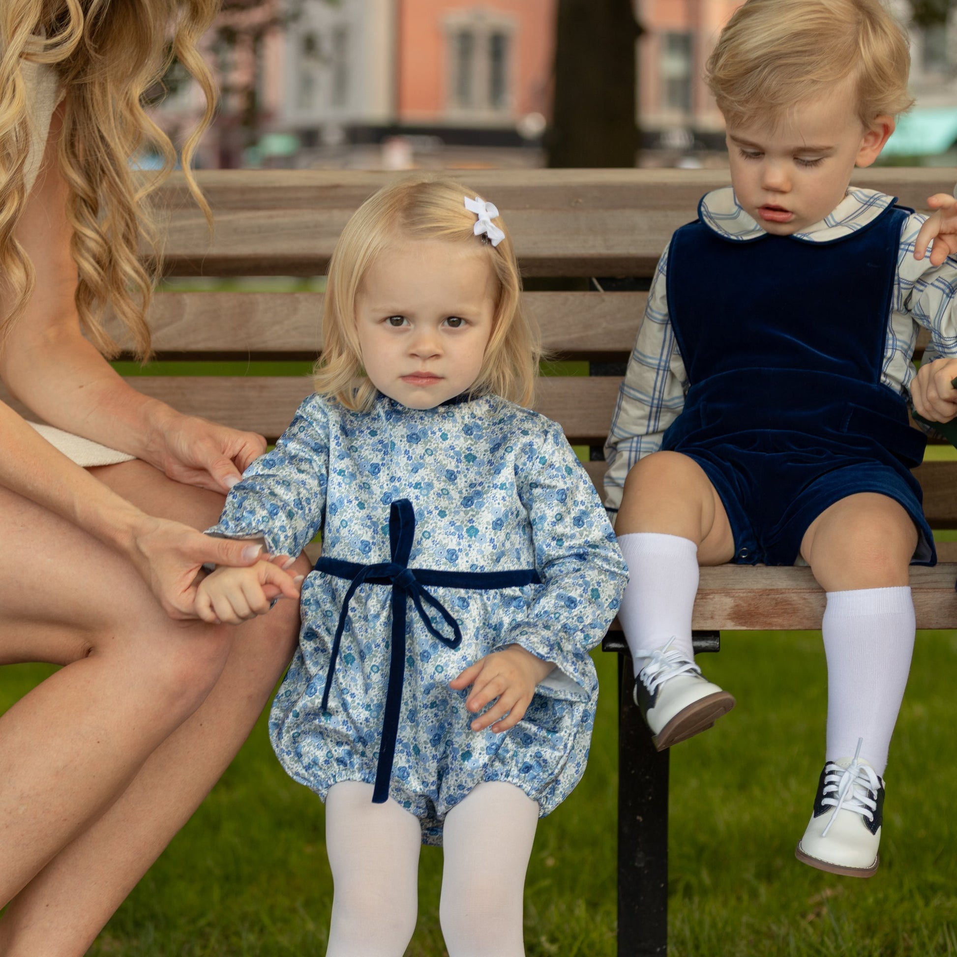 Our Hazel Bubble is a timeless silhouette designed with your littlest girls in mind. Now available in Prescott Petals—a delicate blue floral that coordinates beautifully with our boys' Prescott Plaid—this one-piece is finished with a sweet Back Bay Blue Velvet bow at the waist for an extra touch of fall charm.