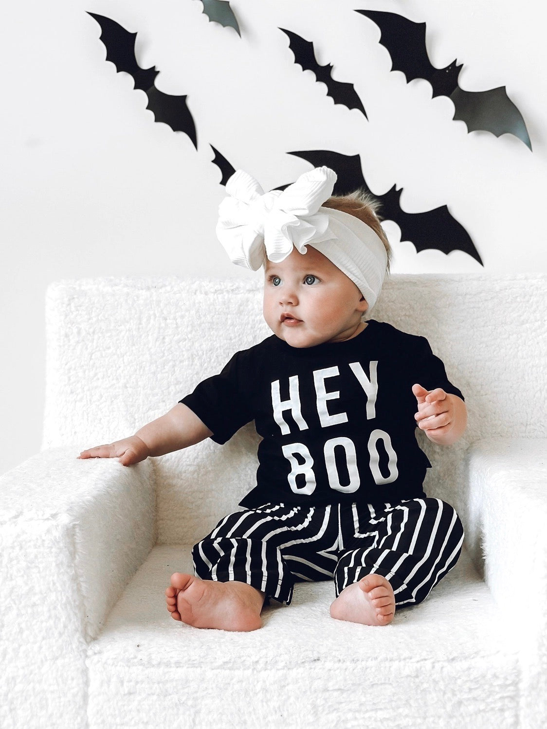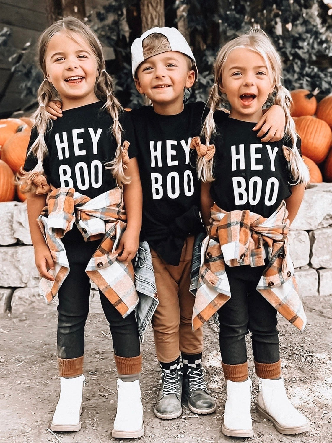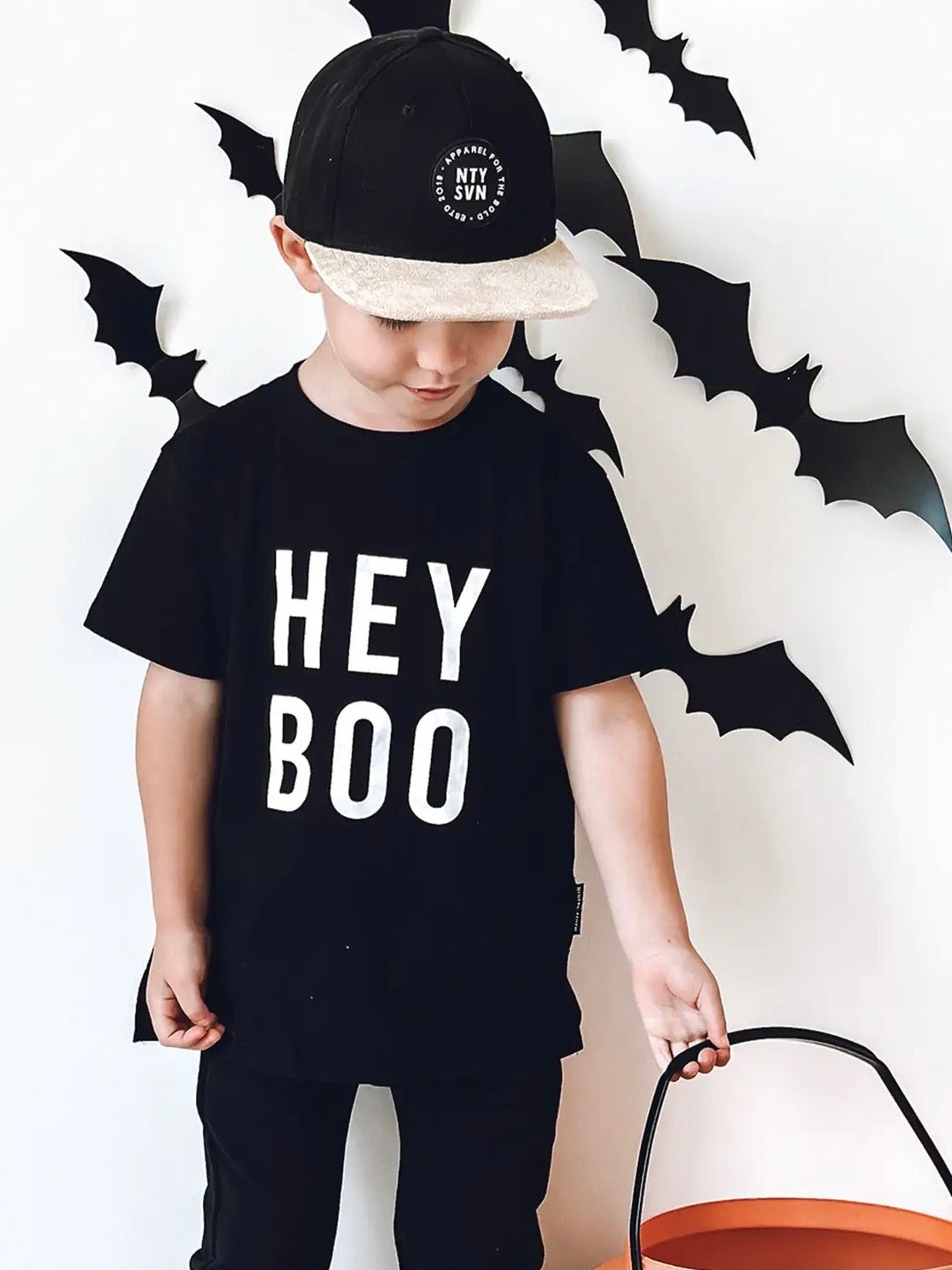 "Hey Boo" is part of our Fall collection. This shirt is a modern and minimal design tailored to all kids during the fall season.