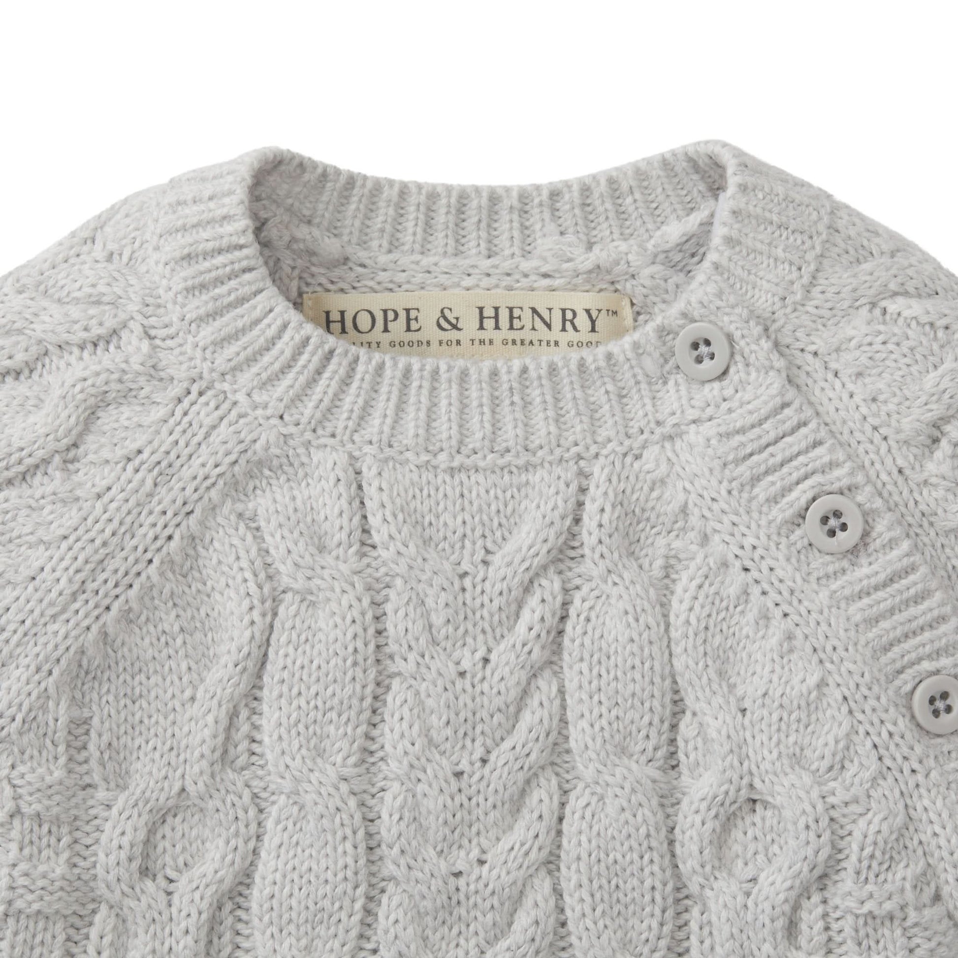 This classic cable knit sweater romper in our signature soft organic cotton will be the heirloom piece for your baby that you hold onto forever. Dressing baby is easy with button openings at both the shoulder and inner legs. Cozy and comfortable, this makes the perfect gift for a sweet little one.