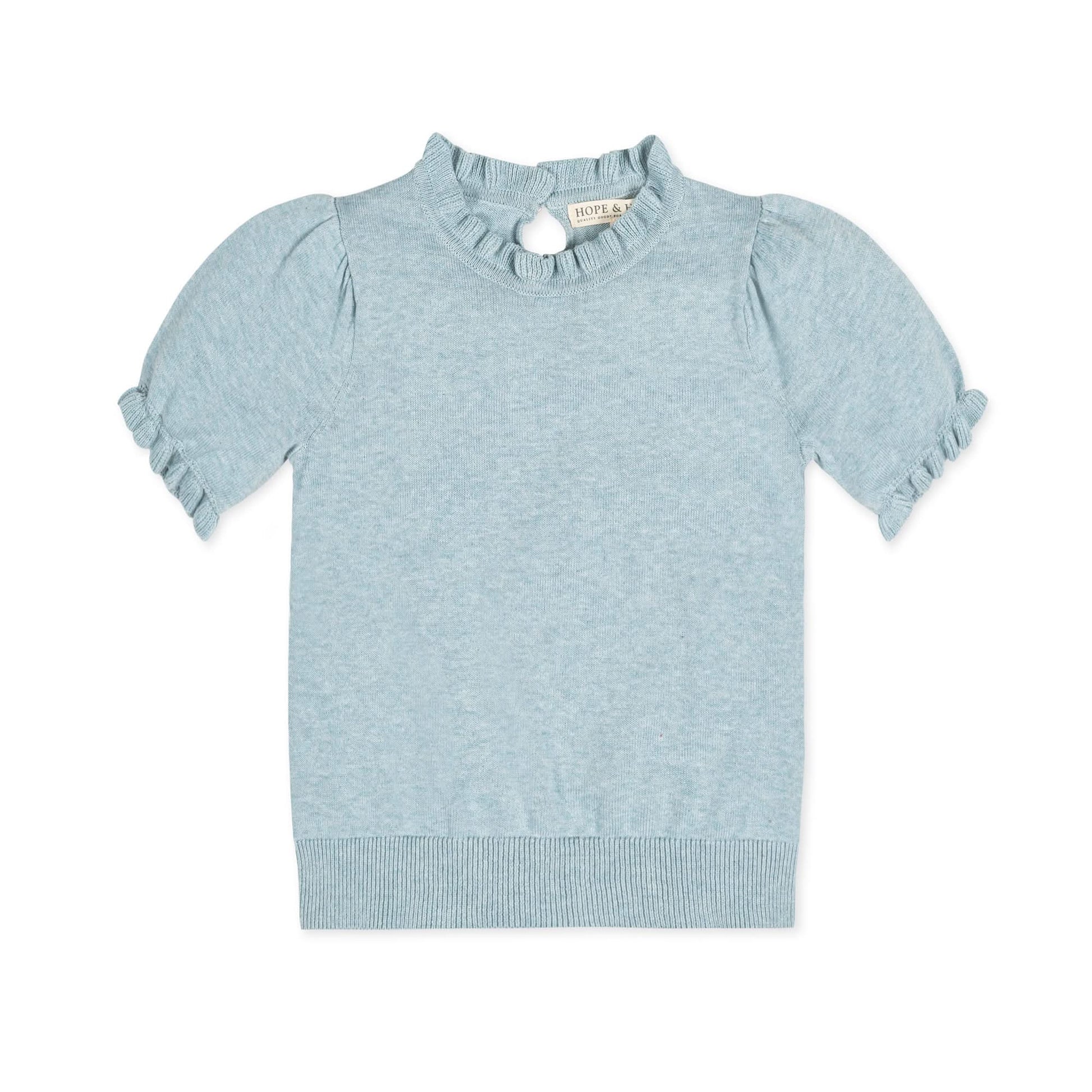 A pretty sweater for fall crafted from soft organic cotton. Features feminine puff sleeves, ruffled edges at the collar and cuffs, and a back keyhole closure with gold button for easy dressing. We love this piece paired with one of our organic cotton skirts for an adorable look.