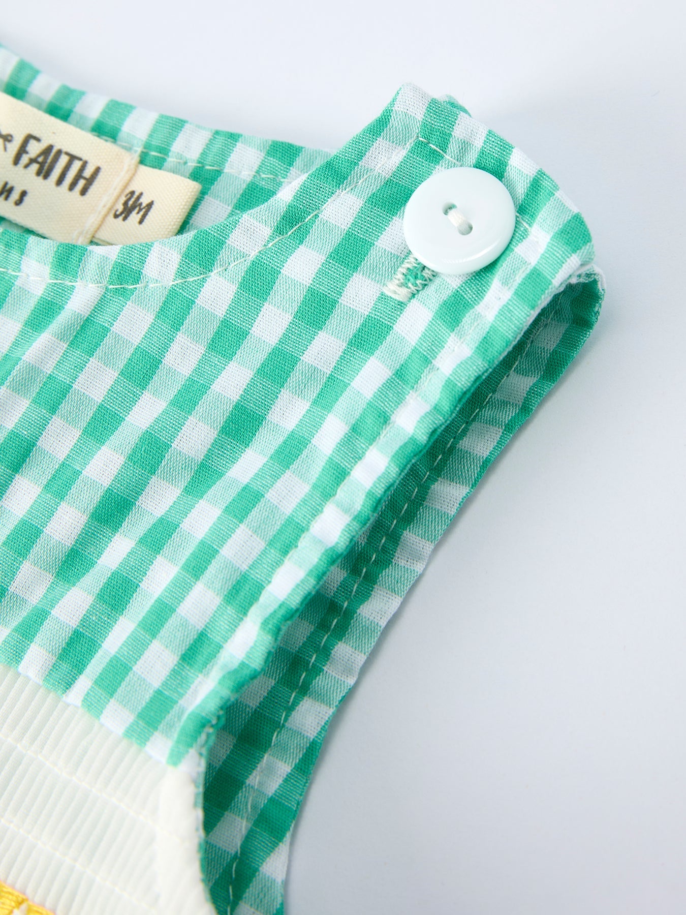 Dress your little one in timeless spring style with this charming gingham romper. Featuring delicate embroidered details and classic smocking across the chest, this piece combines heirloom-quality craftsmanship with everyday comfort. The soft green palette works beautifully for any season, while the one-piece design makes diaper changes and dressing effortless. Perfect for photos, special occasions, or simply elevating his everyday wardrobe. A versatile staple that grows with your child's memories.