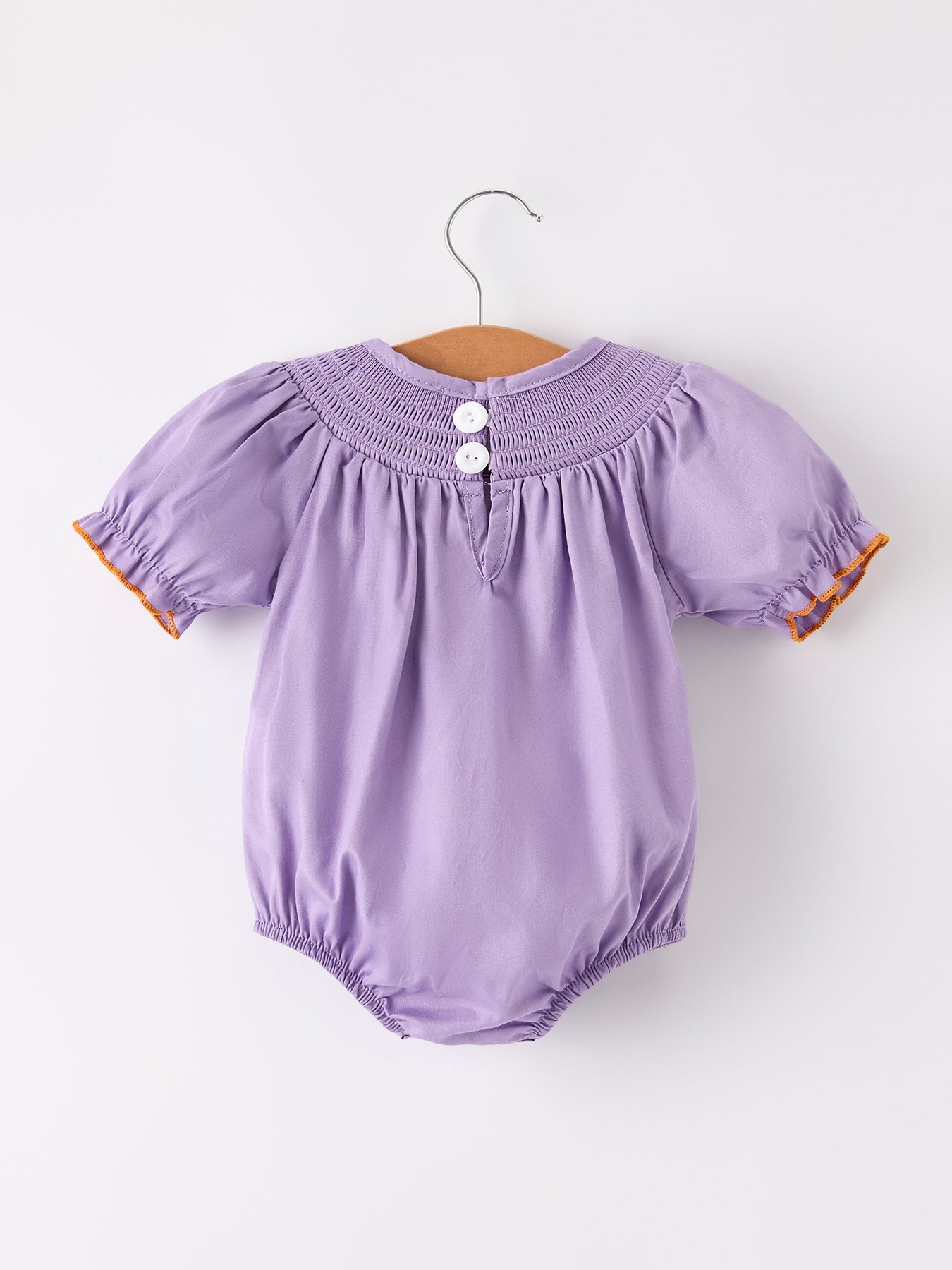 Dress your little one in Halloween charm with this adorable purple smock romper. Featuring delicate embroidery details, this baby girl romper combines festive style with practical comfort. Perfect for Halloween parties, photo sessions, or seasonal outings, this eye-catching purple ensemble will have everyone swooning over your little pumpkin. Designed for both cuteness and convenience during the spooky season.