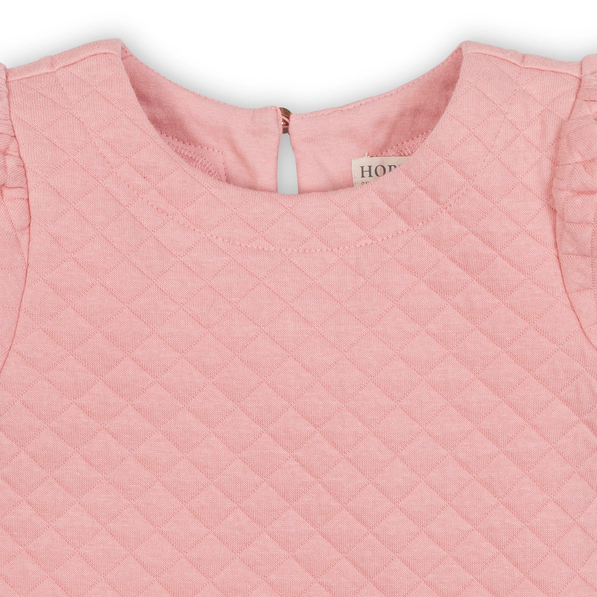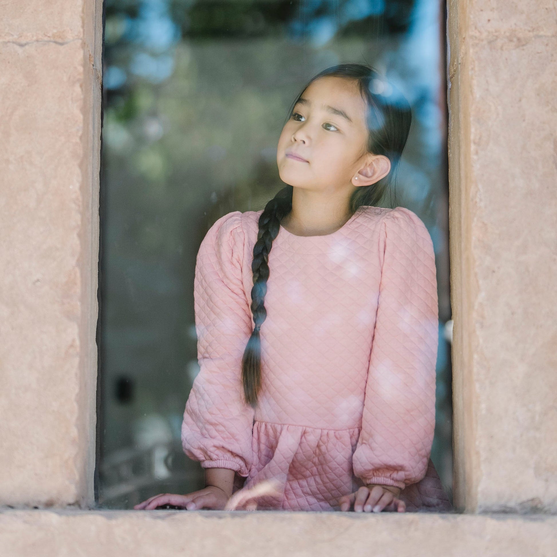 It's all about a beautiful silhouette and subtle texture in our gorgeous quilted drop waist dress. The pretty peasant sleeves and gold button closure down the center back lend a sophisticated feeling, while the organic cotton blend knit fabric is so soft and comfortable to wear. A piece she will love to wear.