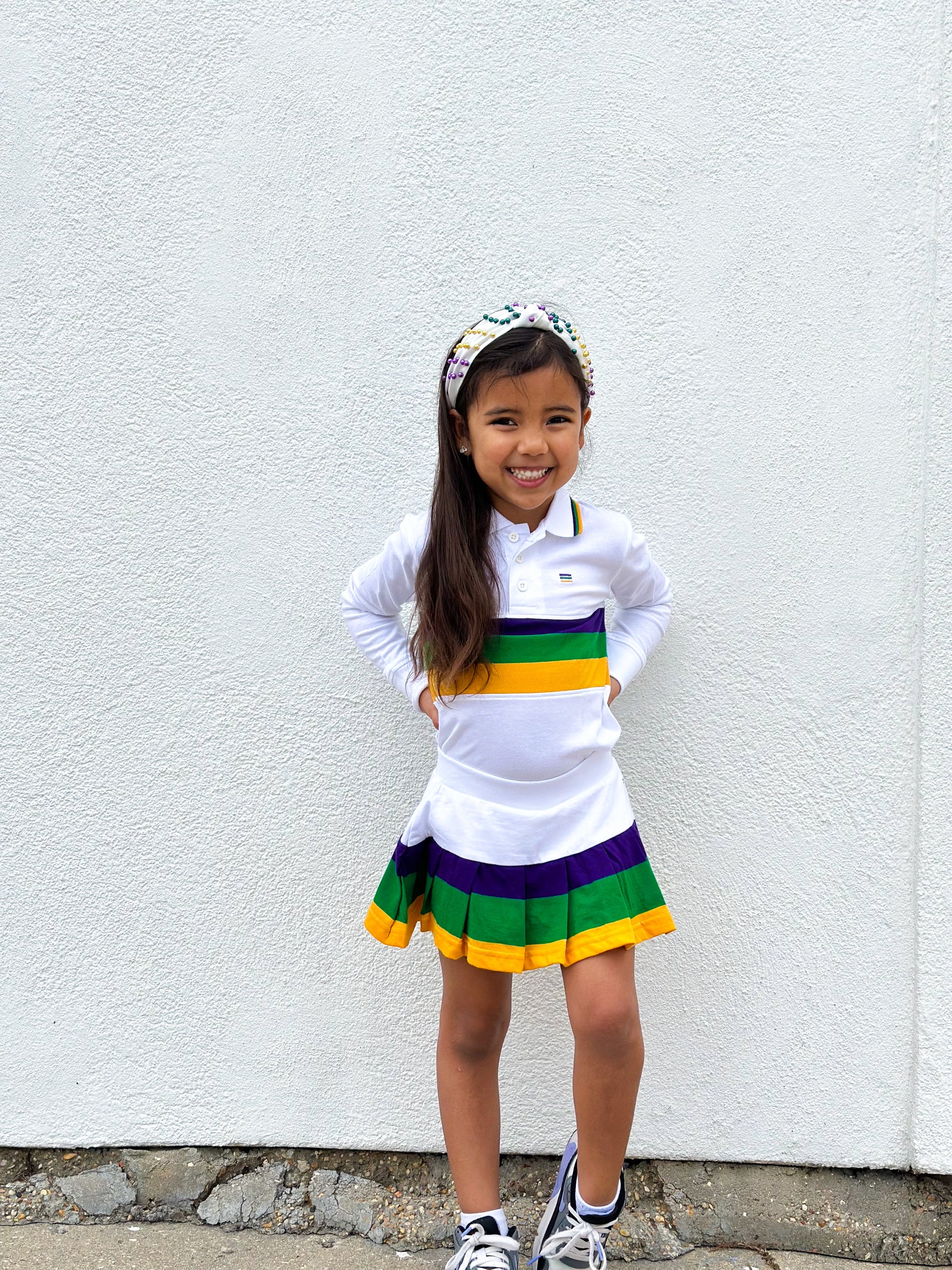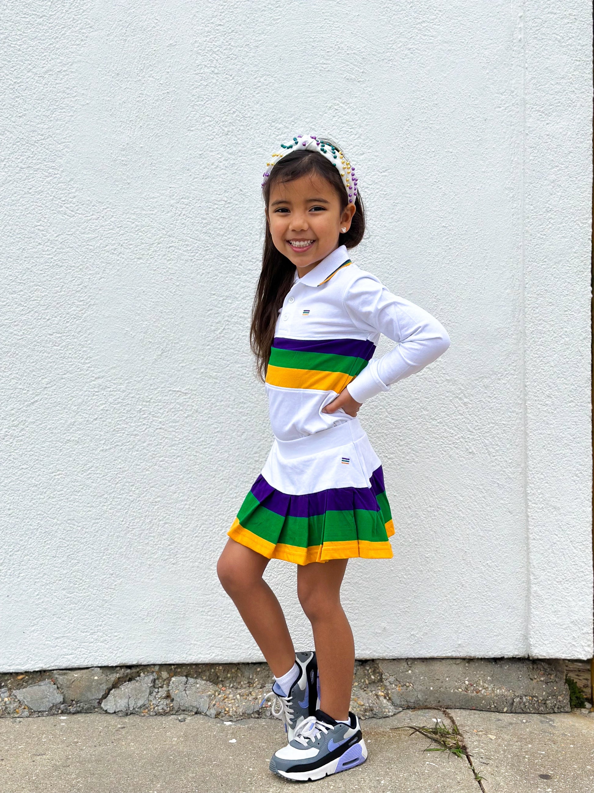 Look cute and stay cool with our Pleated Youth Skorts in White! Perfect for effortless Mardi Gras style, this pleated skort features purple, green, and gold stripes that give off major preppy vibes. Get it now and be the life of the party. 🎉