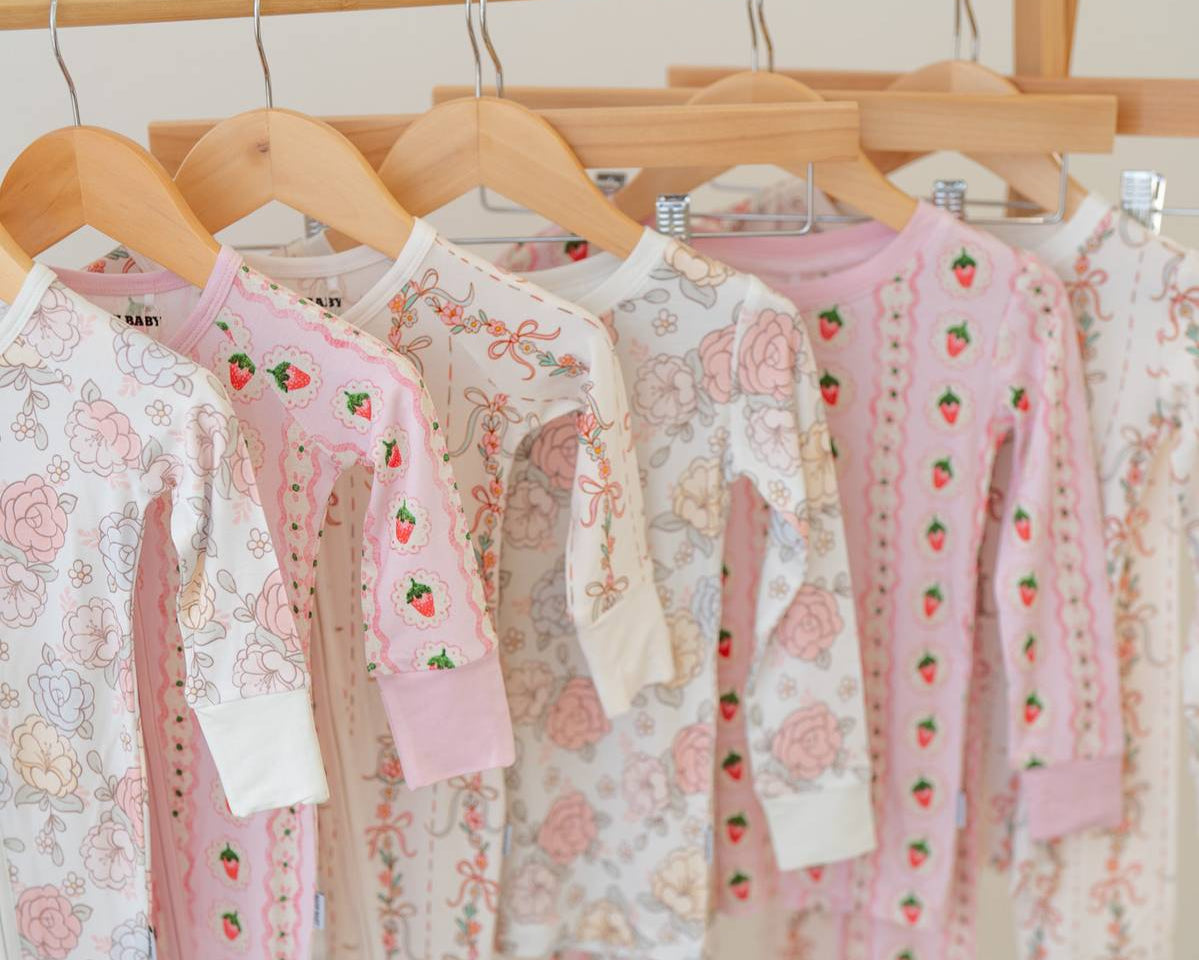 The adorable vintage strawberry stripe, featuring dainty flowers & darling strawberries adds a dreamy, whimsical touch to bedtime, while the lightweight, temperature-regulating fabric keeps them feeling just right all night long. Plus, they’re easy to wash, resistant to shrinking and fading, and made with safety in mind—no flame retardants or itchy tags here!