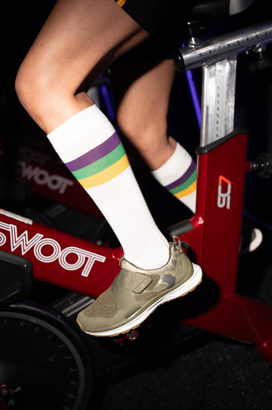 Put a colorful spin on your outfit with our White Stripe Ribbed Socks! These Mardi Gras-inspired socks feature vibrant purple, green, and gold stripes, perfect for adding a playful touch to any look. Available in sizes for infants, kids, and adults, these socks are the perfect match for sneakers and a matching polo. Step into style and comfort with these classic white socks!