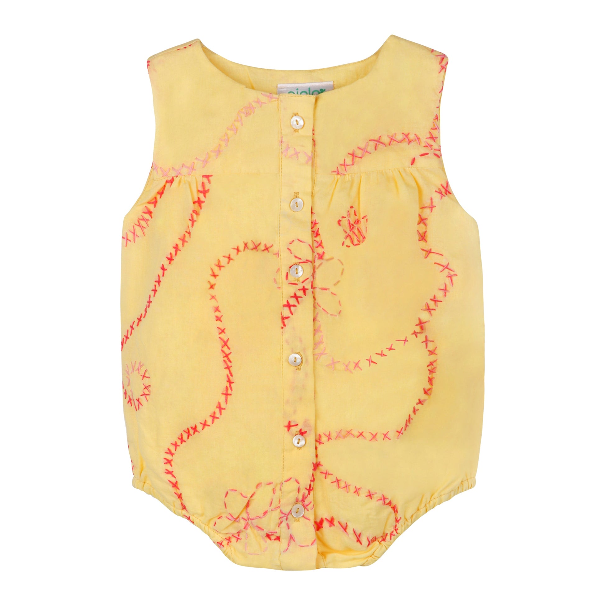- The Yellow Color Jardin Romper is a charming addition to baby girl clothes, celebrating art, fun, and colors.