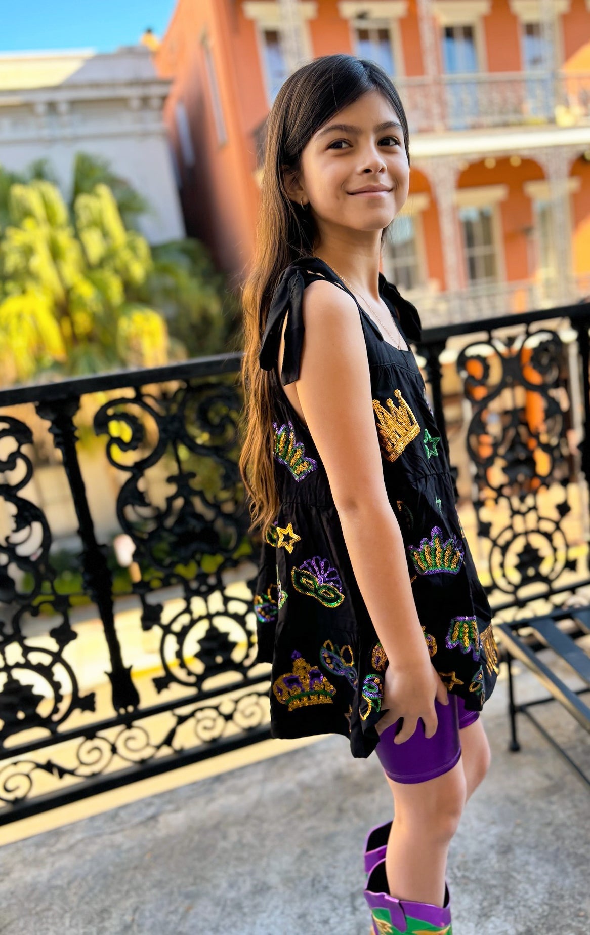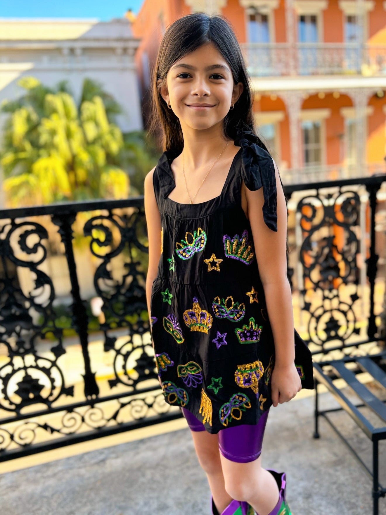 Rule the Mardi Gras parade with our Youth Crowns and Masks Viscose Dress in black. This playful dress features side pockets, crown and mask appliqués, and fun star sequin accents. Faux tie straps add an extra touch of quirkiness to this regal ensemble. Perfect for your little Mardi Gras princess!
